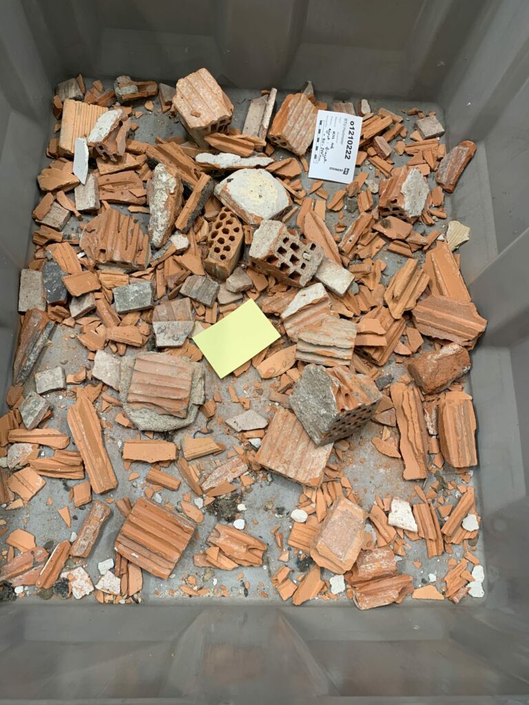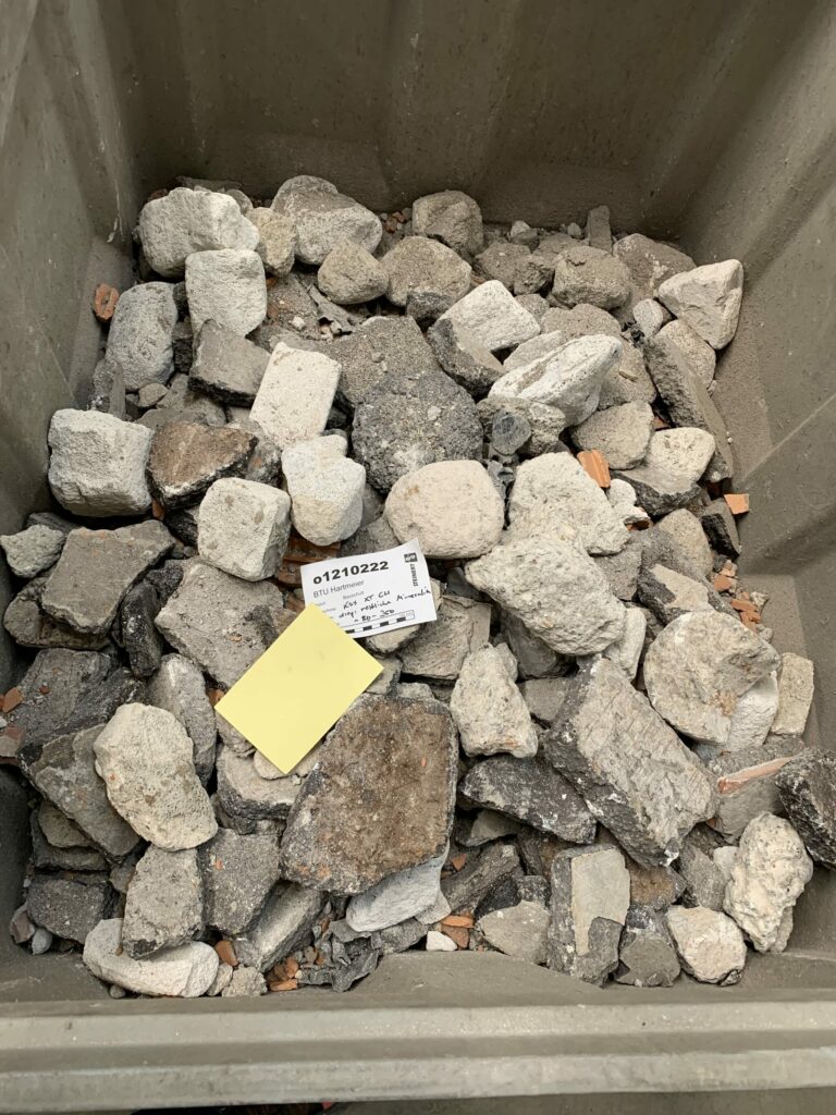 Die Frage, ob es möglich ist, aus gebrochenem gemischtem und stark verunreinigtem Bauschutt, diese vorhandenen Fremdanteile/ Störstoffe zu entfernen bzw. einzelne Bauschuttfraktionen zu separieren, stand bei den ersten Versuchen dieser Art im Mittelpunkt. Die Versuchsanlage der Fa. Steinert bietet die Möglichkeit solche Versuche möglichst realitätsnah zu simulieren. Die Anlage besteht aus klassischen Magneten, Nichteisenmetall-Scheidern, sensorbasierten Sortiersystemen und weiteren Vorbereitungsstufen. Dabei spielen die Separation von Holz, Kunststoff wie PE (Polyethylen) und PP (Polypropylen), Mineralik, schwarzen Objekten oder zum Schweben neigenden Materialien wie Folien oder Papier eine Rolle.