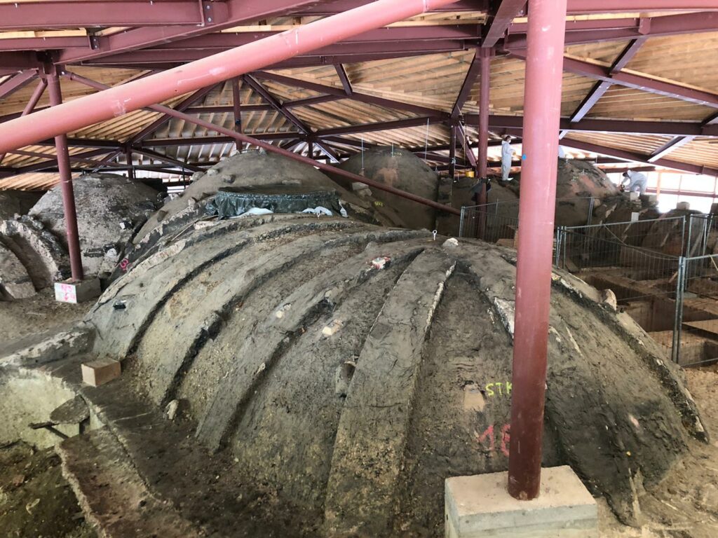 Since summer 2020, we have been manually removing the up to 30mm thick tar coating from the brick vaults using small chisels. With PPE, seat straps, on roof ladders and self-made auxiliaries, the tar layer (PAK values up to 54,700mg /kg) then removed at the domes up to 9 m high and pulled with cable pull and buckets to just before the containers. The tarmac-free areas are sucked off by industrial vacuum cleaners every working day. Here too the DGUV Rule 101-004 is applied and checked by the SiGeKo and the construction management.